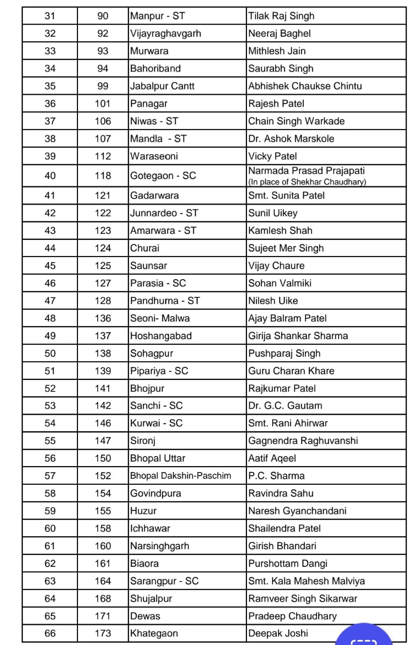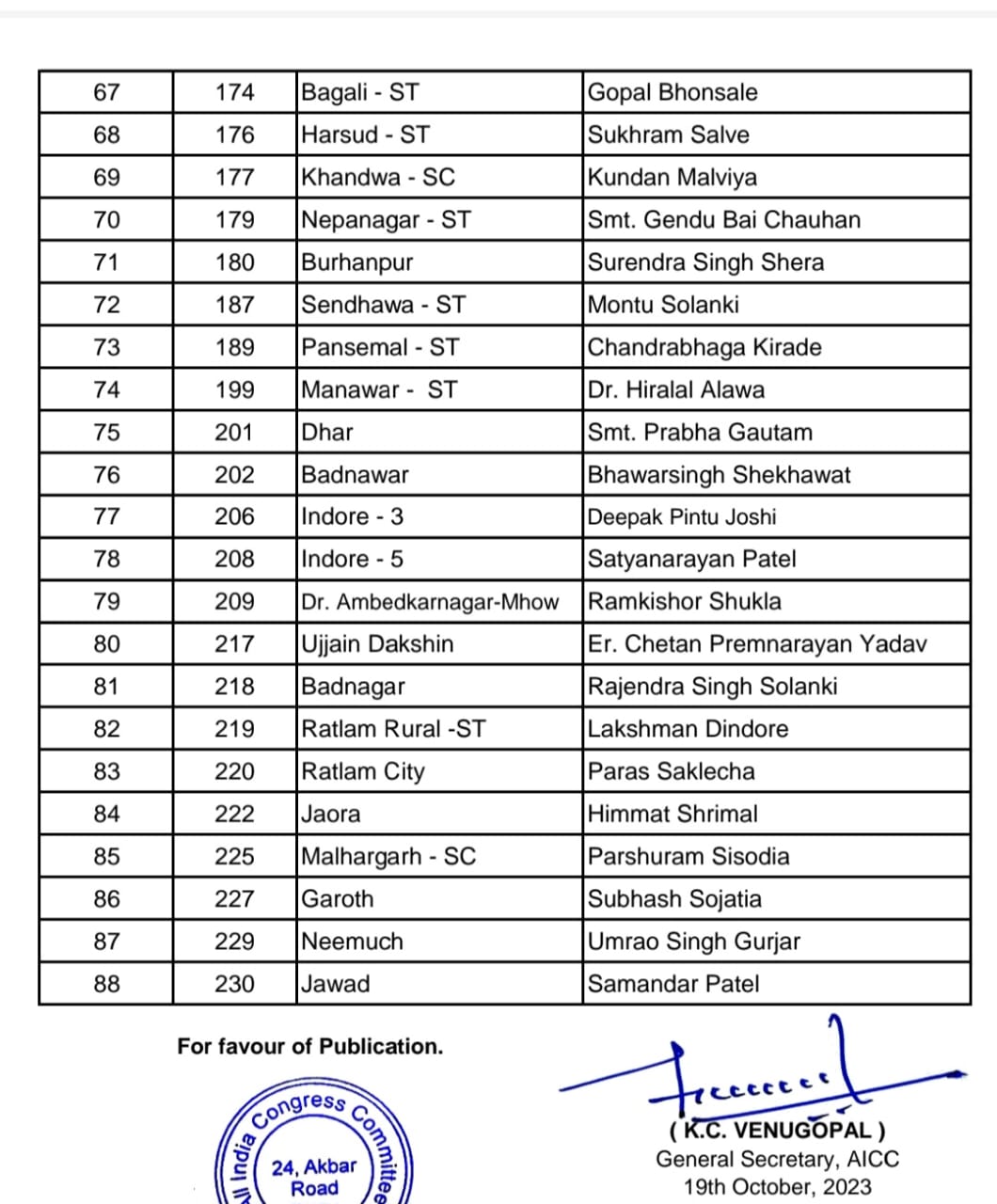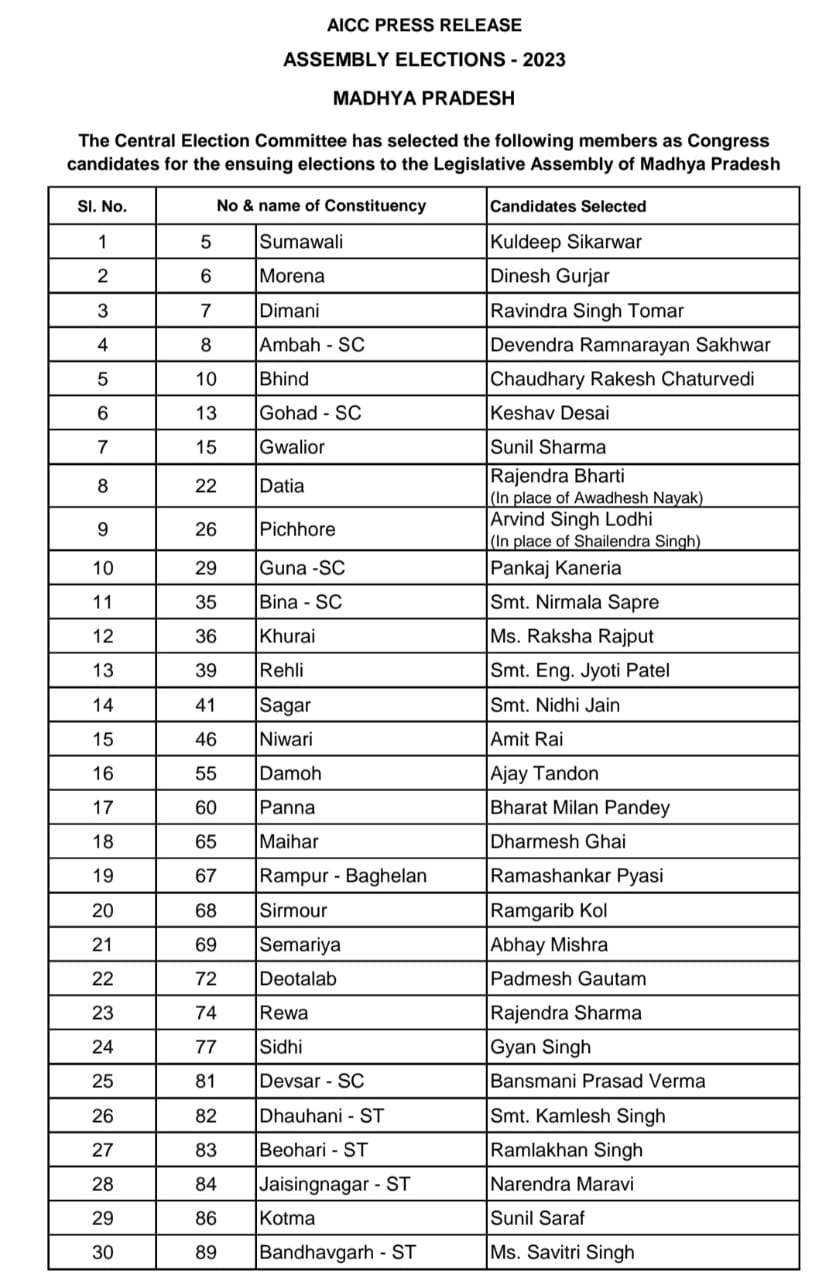 मध्य प्रदेश में कांग्रेस ने उम्मीदवारों की दूसरी लिस्ट की जारी