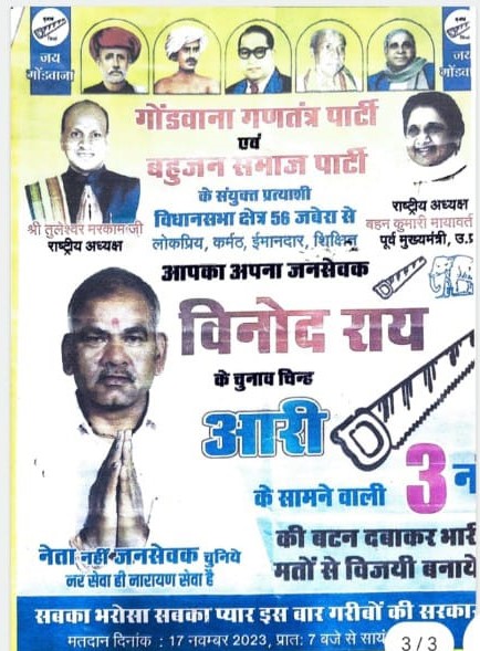यह कि बहुजन समाज पार्टी जिला इकाई दमोह श्रीमान से शिकायत पत्र के माध्यम से विनोद राय के द्वारा किए गए आपराधिक कृत्य के विरूद्ध आपराधिक प्रकरण दर्ज कर कार्यवाही सुनिश्चित करने के लिए अनुरोध करती है।यह कि बहुजन समाजपार्टी दमोह शिकायत पत्र के साथ की जा रही प्रचार प्रसार सामग्री के दस्तावेज संलग्न कर रही है तथाकथित गौडवाना गणतंत्र पार्टी के अभ्यर्थी विनोद राय पर विधि अनुसार भारतीय दण्ड संहिता के अंतर्गत आपराधिक प्रकरण दर्ज किया जावे निर्वाचन की प्रक्रिया के अंतर्गत दिनांक 17/11 / 2023 को मतदान दिवस है इसीलिए तथाकथित अभ्यर्थी विनोद राय के विरूद्ध तत्काल कार्यवाही किया जाना न्यायसंगत होगा समय पर न कि जाने वाली कार्यवाही के कारण हमारे दल का असंवैधानिक व भ्रामक प्रचार करने से संगठन व विचार धारा से भलिभूत पदाधिकारी व कार्यकताओं के बीच भ्रामक स्थिति होने से क्षति पहुंचेगी।